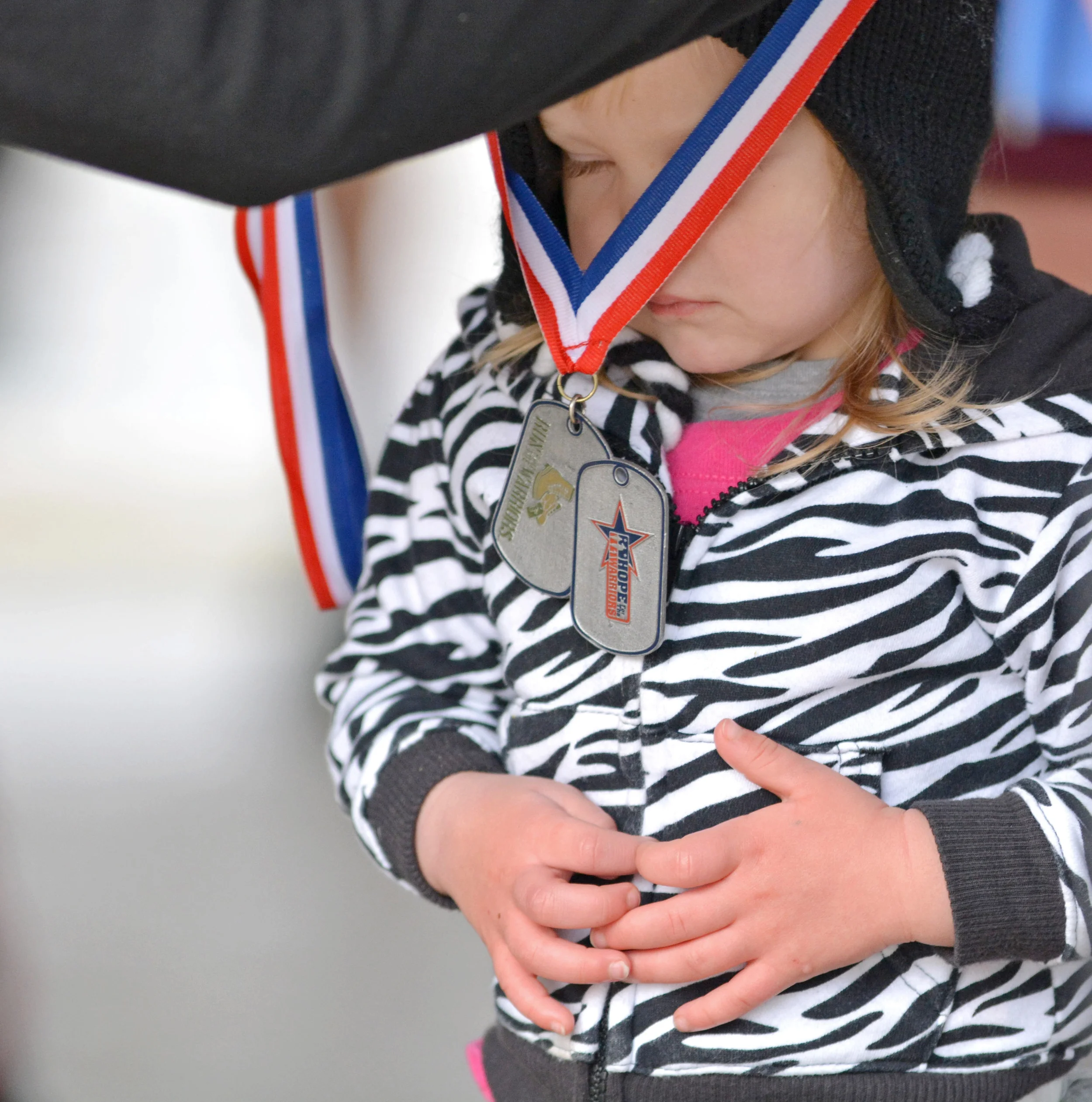 Shannon Lambert, 2, of Marion, Ill., receives her dogtags after she and her father Nicholas participated in the "Run for the Warriors" 5K on March 22 at SIU Carbondale's Campus Lake in Carbondale, Ill.