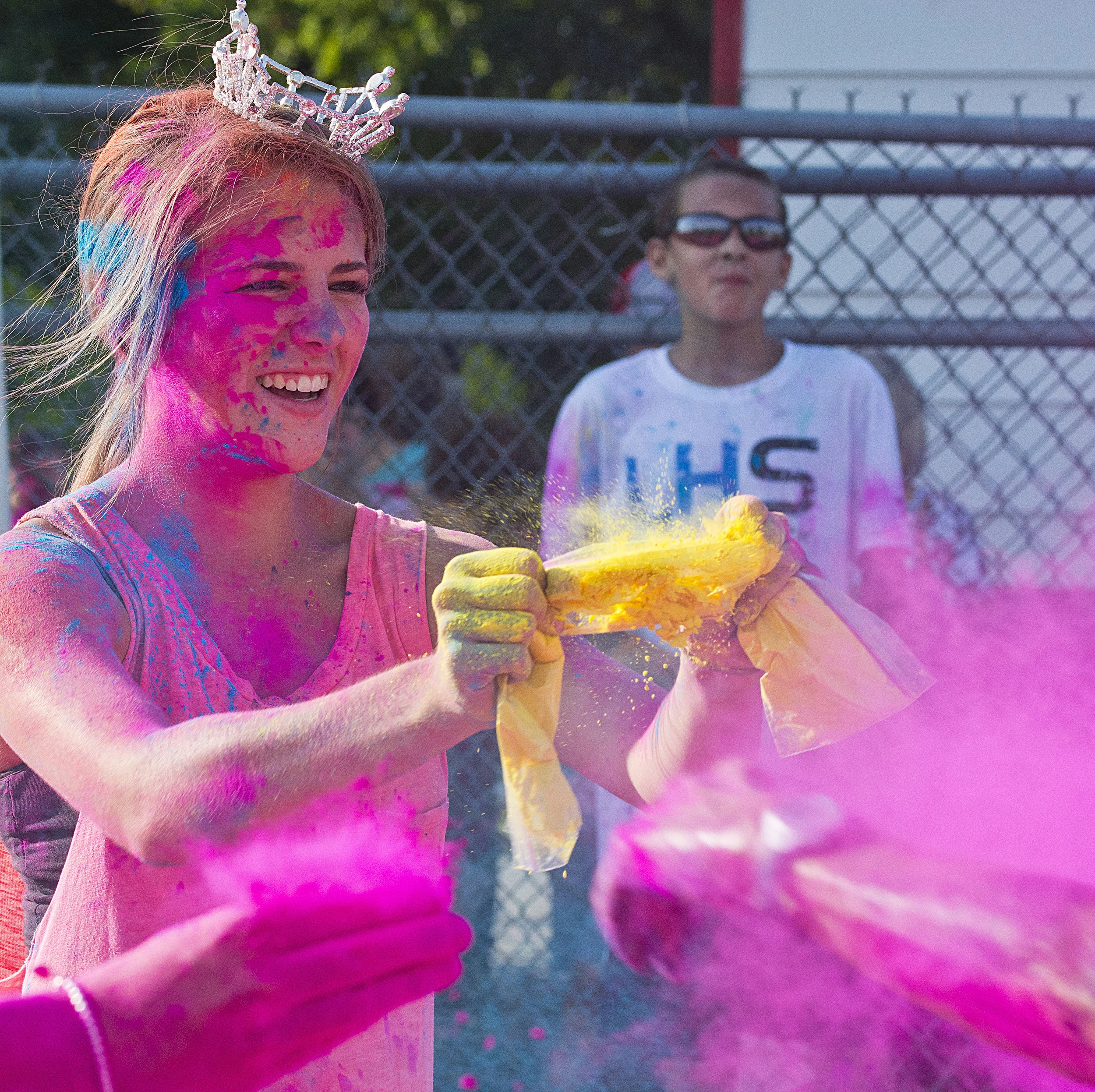 Haley Johnson, 16, of Pinckneyville, Ill., helps douse participants with color powder during the "Color Me for Light" 5K Run on Sept. 1 at the Williamson County Fairgrounds in Marion, Ill.