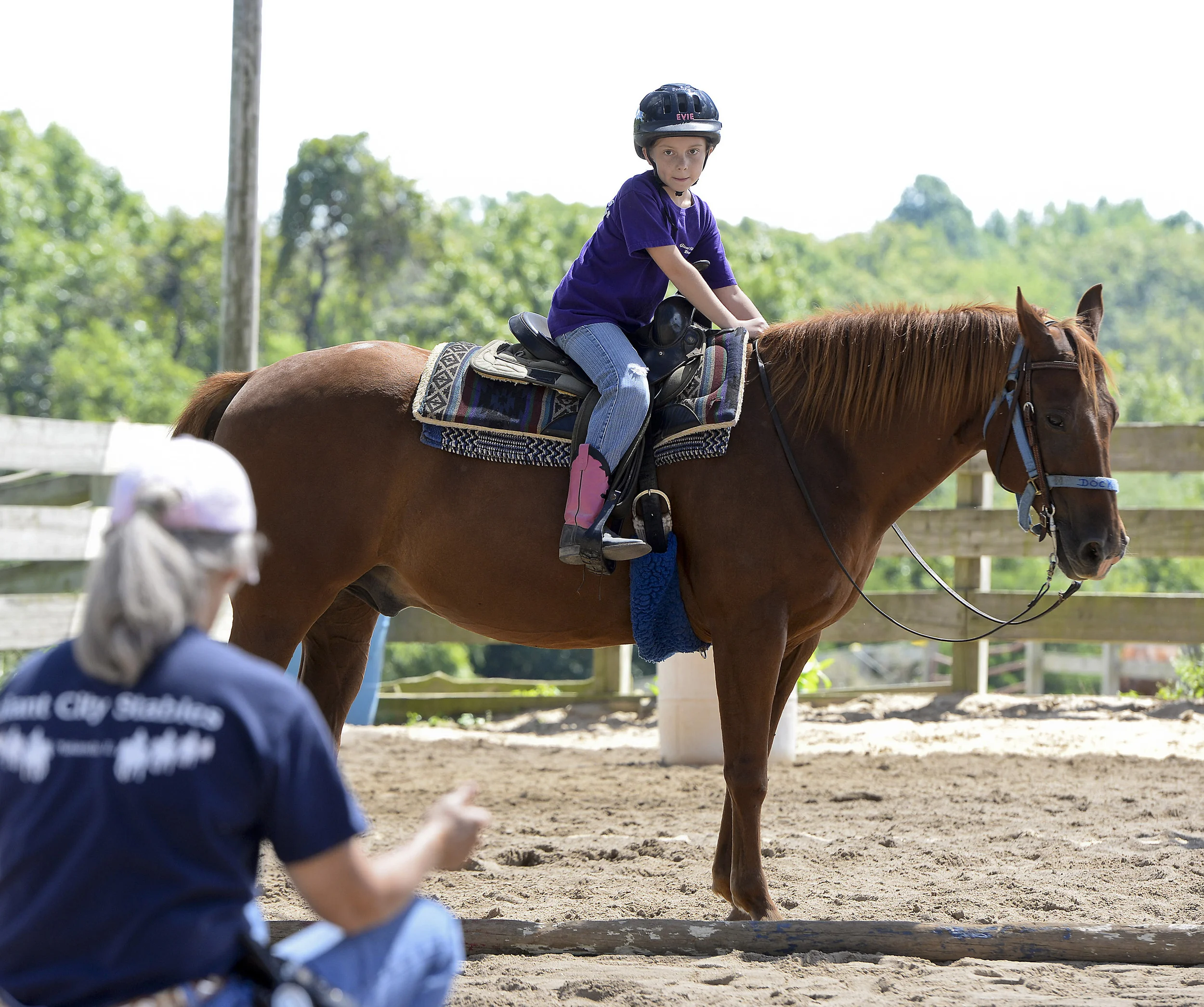 Evelyn Eddings, 9, of Anna, Ill., receives a lesson from her instructor Ramona Twellman on Sept. 7 at Giant City Stables in Makanda, Ill.