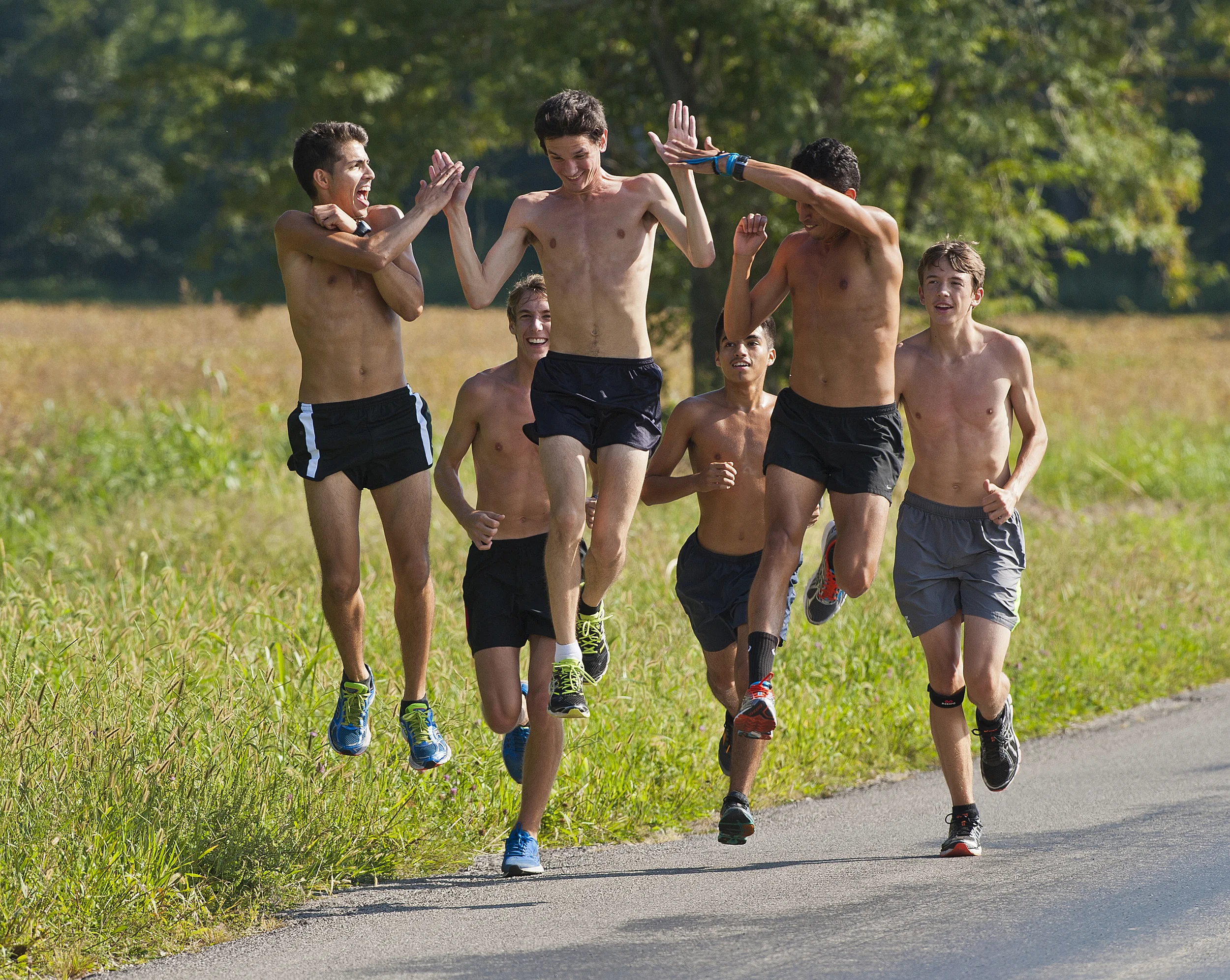 Evan Ehrenheim, center, receives high-fives from cross-country teammates Oscar Medina, left, and Juan Carrera, right, on Sept. 17 while jogging up Dogwood Drive in Carbondale, Ill.