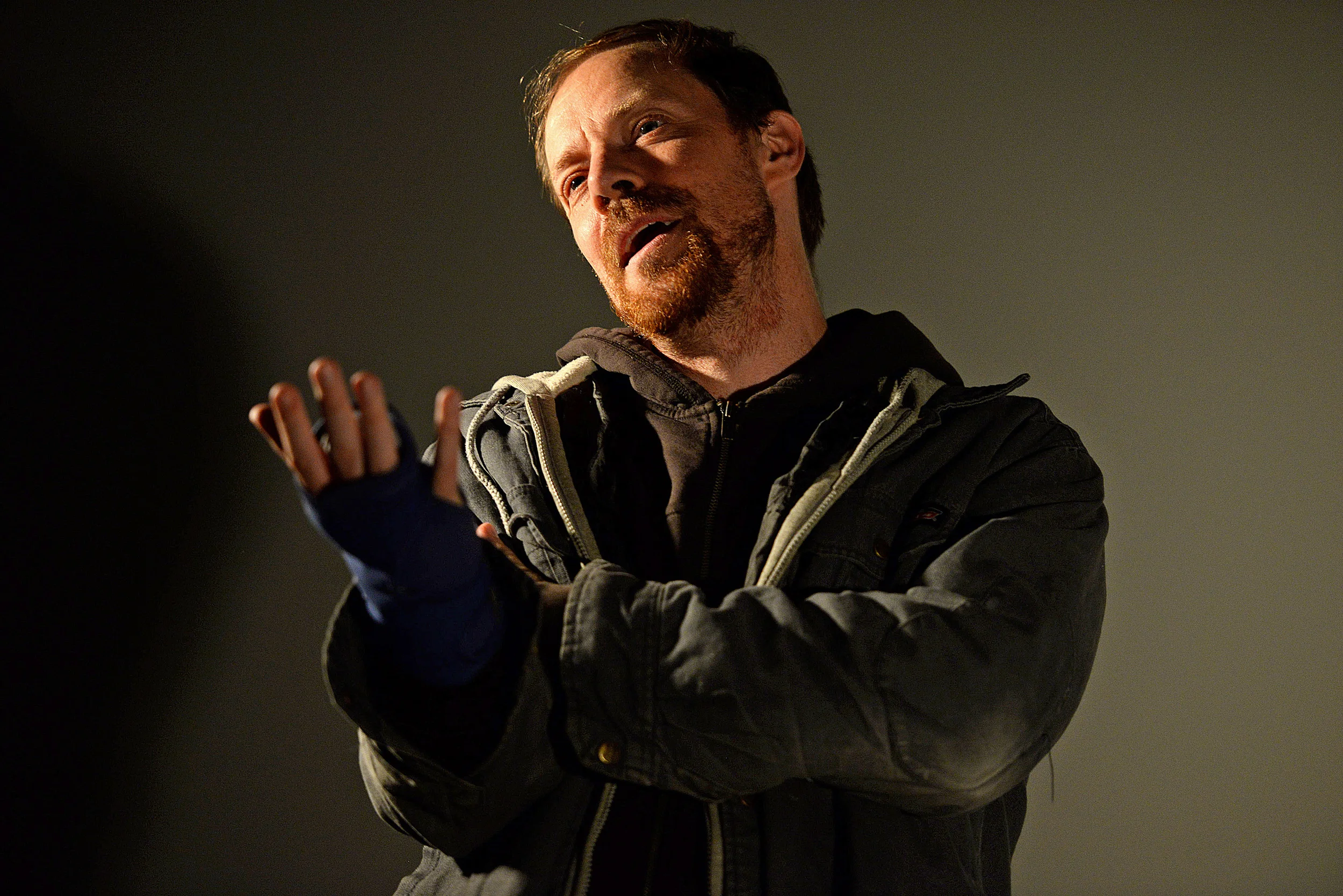 Michael Milligan, of New York, acts out a scene from his one-man play "Mercy Killers" on Sept. 22 at Guyon Auditorium in Morris Library.