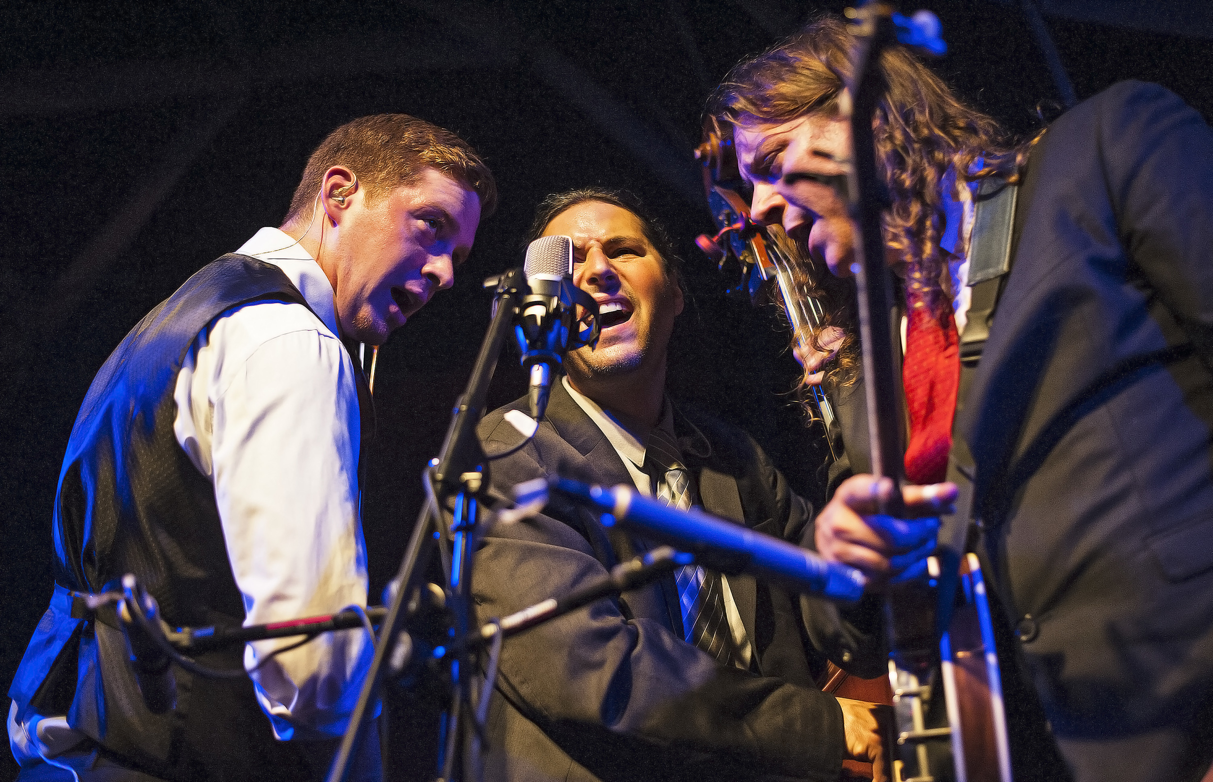 Dan Andree, left, Jon Goldfine, center, and Ben Wright, of Henhouse Prowlers, perform at Hangar 9 on Sept. 27. The band, of Chicago, has been playing bluegrass music for more than 10 years.