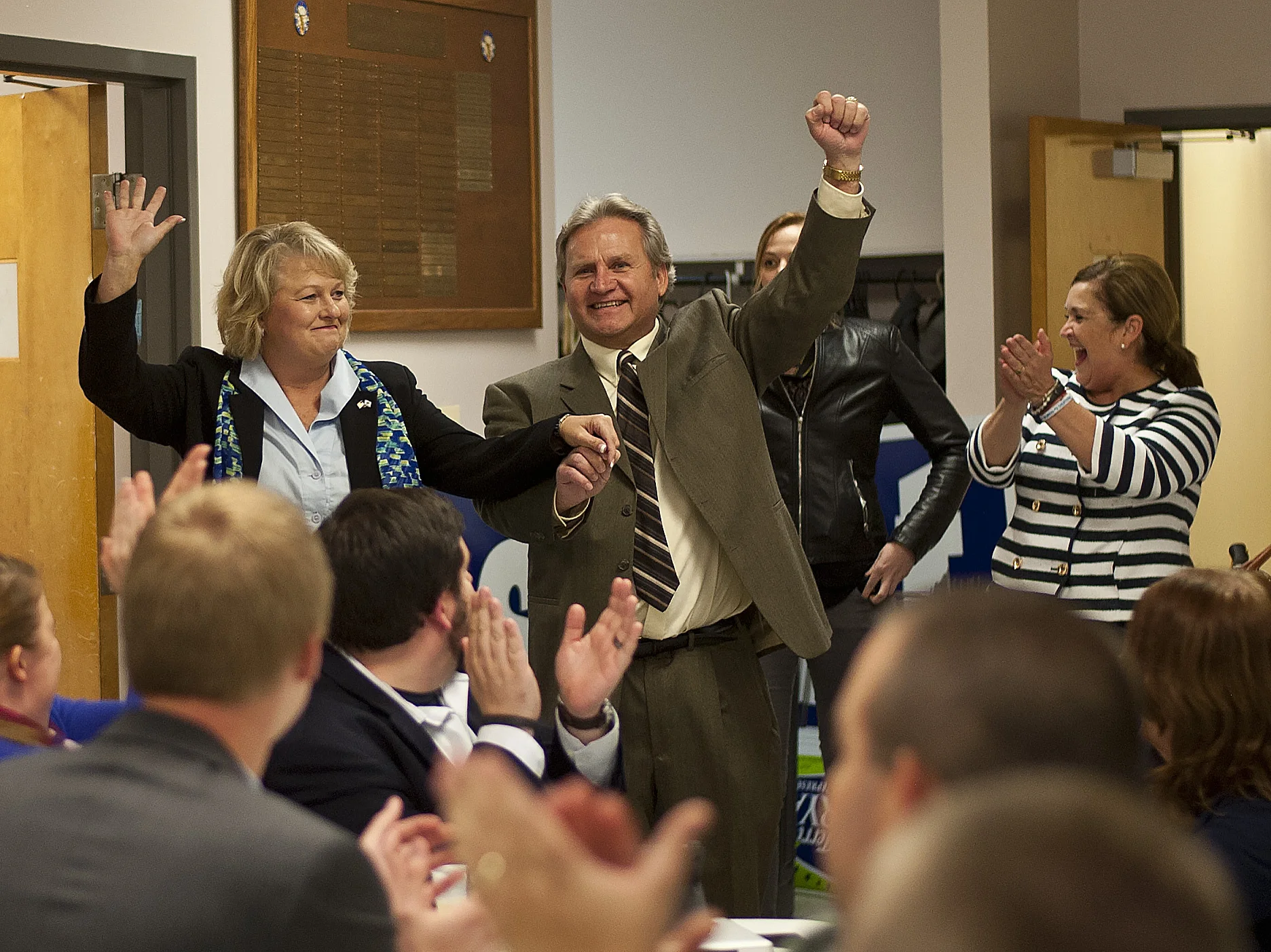 Terri Bryant (R-Murphysboro) and her husband Rick arrive at the Elks Lodge in Murphysboro, Ill., to cheers and applause from supporters. Terri Bryant defeated Bill Kilquist (D-Murphysboro) to win the 115th House District.