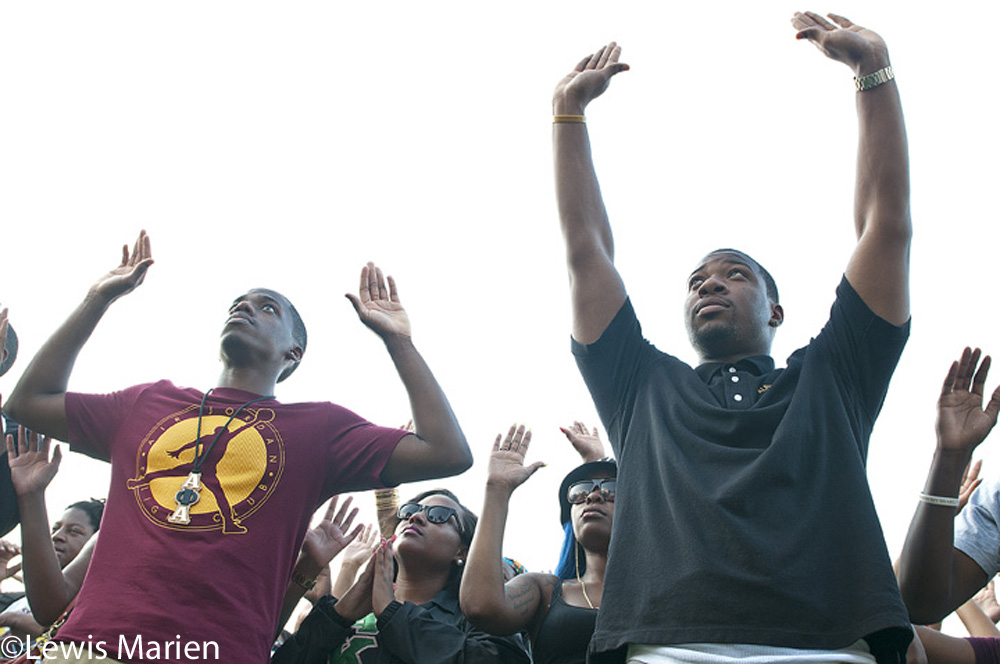 SIU students participate in the "Hands Up, Don't Shoot" rally on Aug. 18 in front of Grinnell Hall. The rally shed light on the recent violence outbreaks in Ferguson, Mo., and the death of 18-year-old Michael Brown, who was shot by a St. Louis County police officer on Aug. 9.