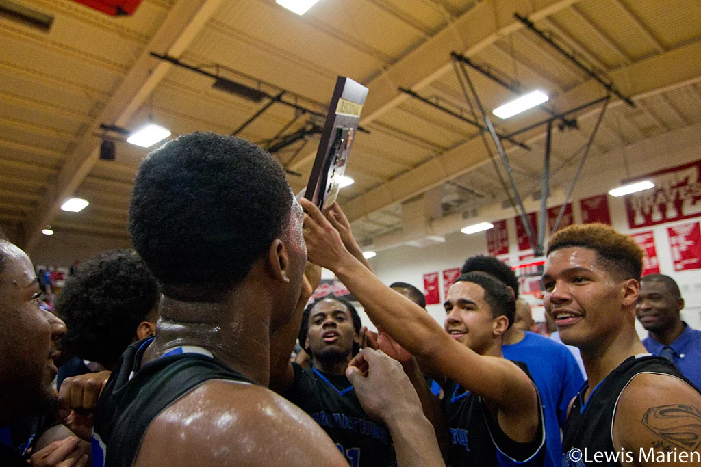 MacArthur celebrates their Mount Zion Regional championship win against the Lincoln Railers at Mount Zion High School in Mount Zion, Ill. MacArthur won 57-38.