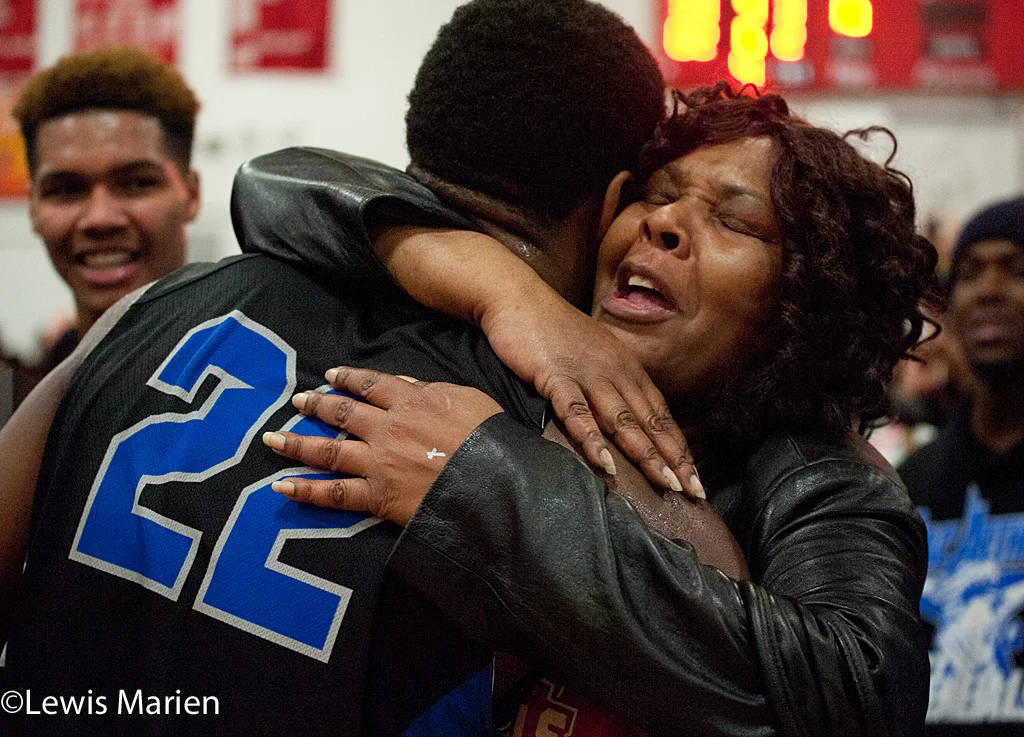 MacArthur's Kamari Jones (22) receives a hug after the Generals' regional championship game with the Lincoln Railers at Mount Zion High School in Mount Zion, Ill. MacArthur won 57-38.