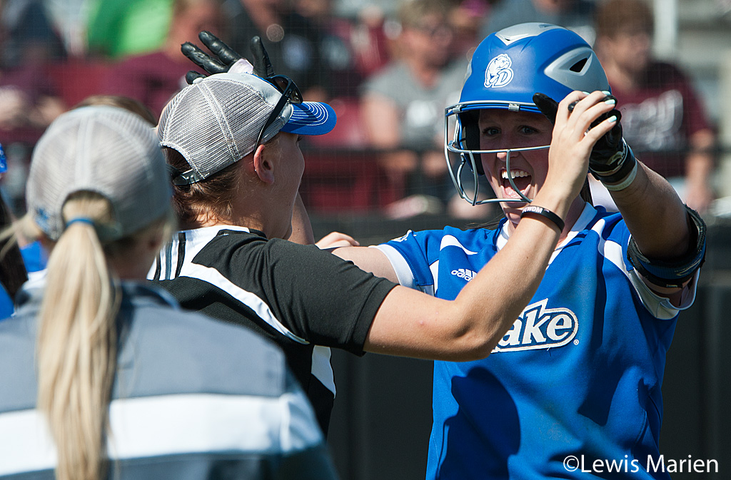 Drake University's Laura Brewer (3) is congratulated by her teammates after a home run during Game 2 of a doubleheader against Southern Illinois at Charlotte West Stadium. Drake beat SIU 4-1.