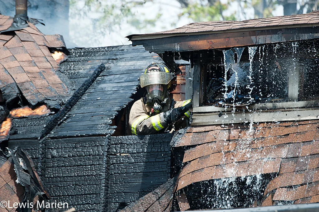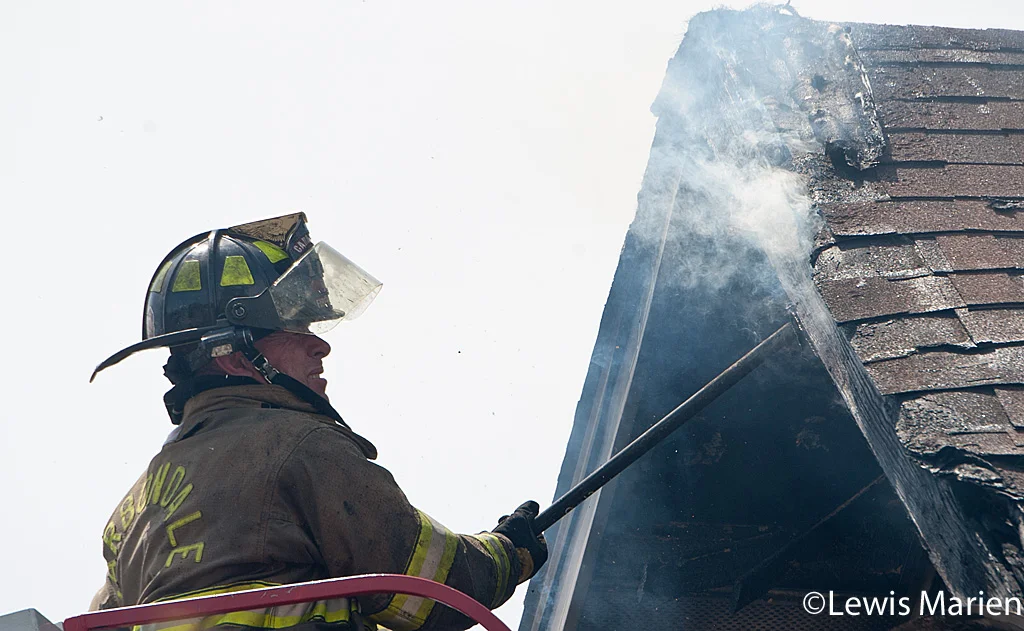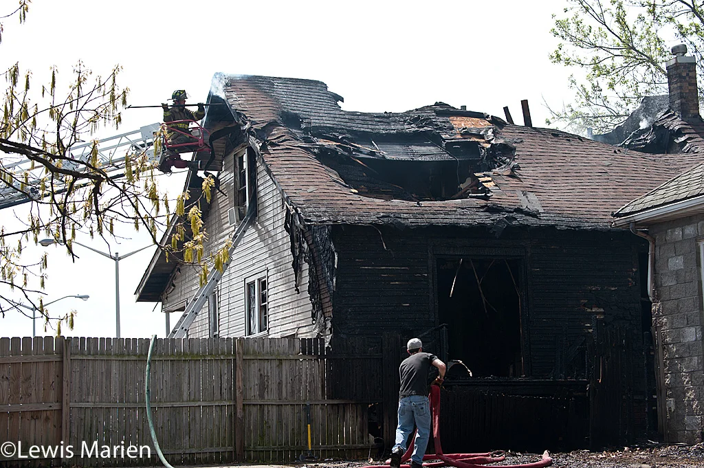 Carbondale Fire Department firefighter Bradley Lam checks for hotspots on the roof of 208 W. Hospital Drive in Carbondale while another firefighter rolls up a fire hose next to the back wall of the house.