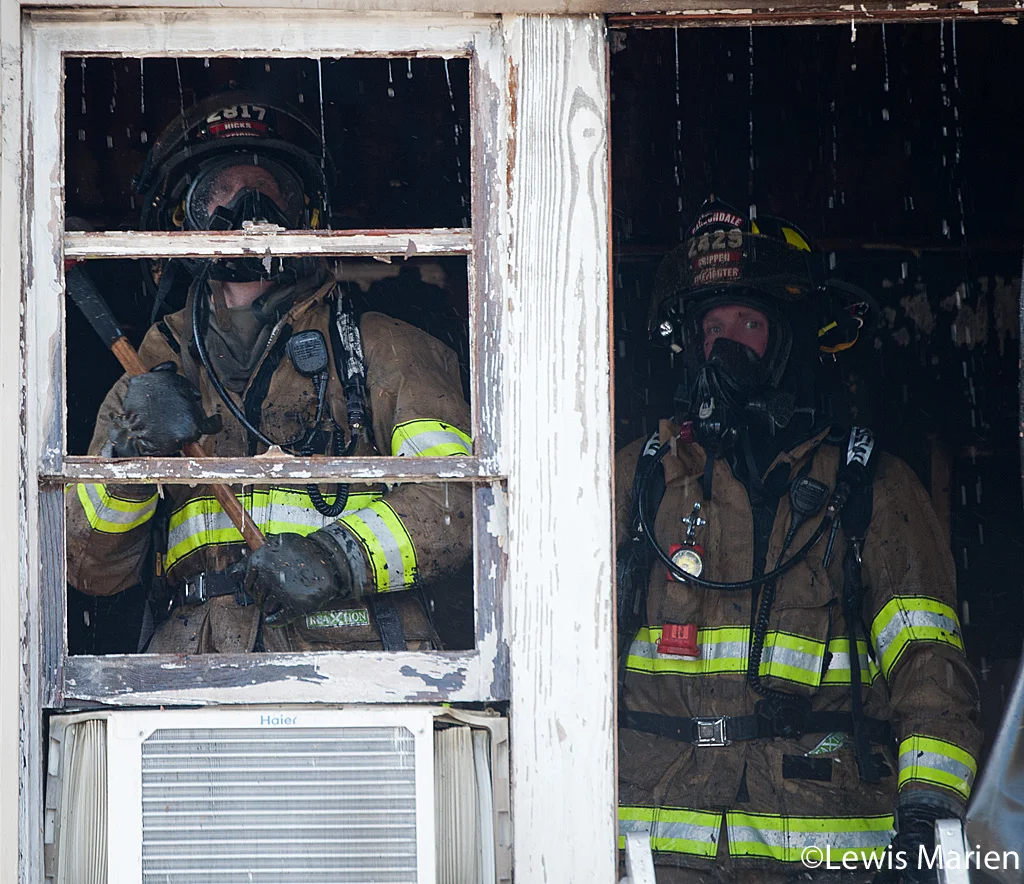 Carbondale Fire Department firefighter Wesley Clemmons (left) and Assistant Chief Stephen McBride talk after putting out a house fire at 208 W. Hospital Drive in Carbondale.