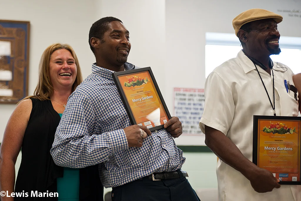 Milton Barbee, center, of Decatur, Ill., jokes around while being recognized during the Mercy Gardens' graduation of its first class on Jul. 10 at the Good Samaritan Inn in Decatur, Ill. Mercy Gardens, a horticulutral job skill training program, is a partnership with the Good Samaritan Inn and Decatur Is Growing Gardeners (DIGG), and helps individuals change their lives around to learn new skills.