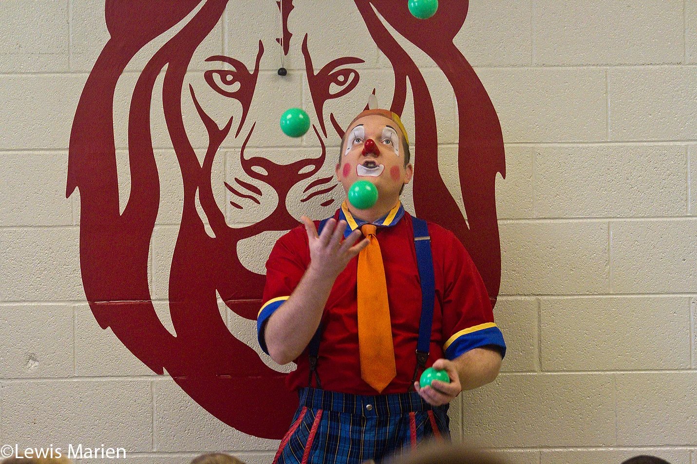 Aaron Rider, of Hugo, Okla., also known as "Melvino the Clown" in the Kelly Miller Circus, performs a juggling trick for children at Galesburg Christian School on Sept. 17. The performance addressed the importance of education and as a way to bring awareness that Calvary Assembly of God in Galesburg will be hosting the Kelly Miller Circus in October.
