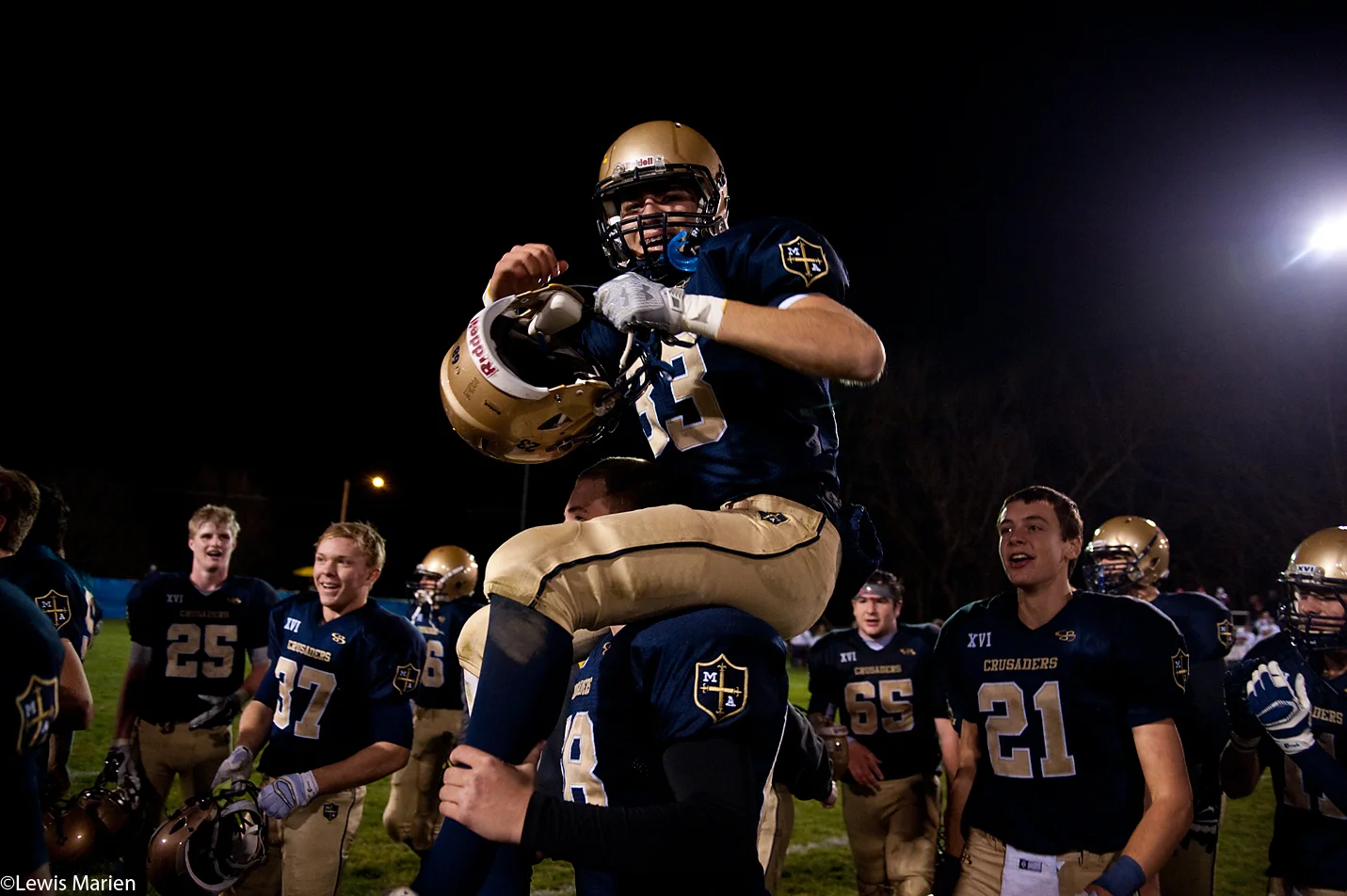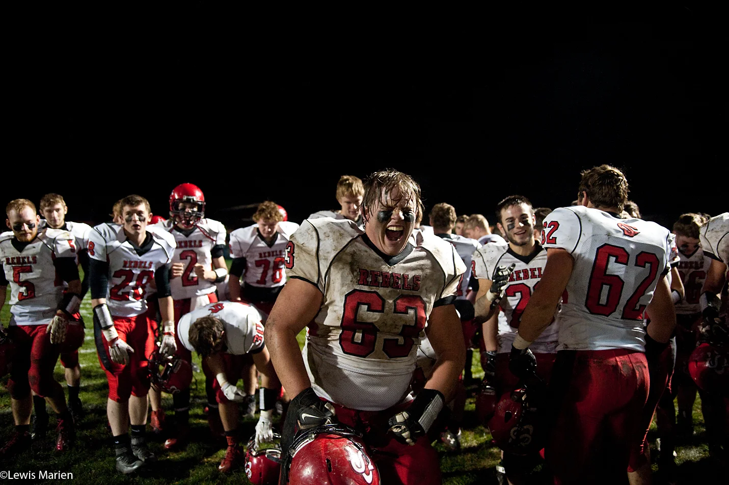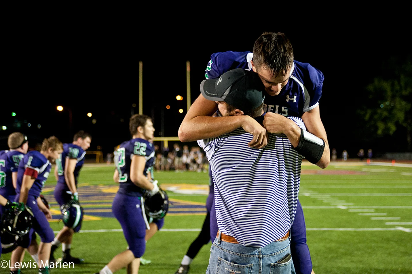 South Fulton's Trace Hood leaps into the arms of his father, Don, after the Rebels defeated the Abingdon-Avon Tornadoes 32-26 on Sept. 25 at Western Illinois University's Hanson Field in Macomb, Ill.