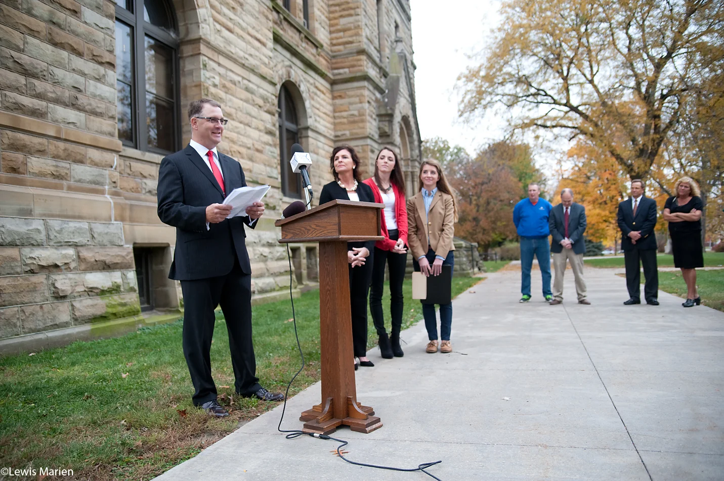 Illinois Treasurer Michael Frerichs, D-Champaign, speaks at a news conference on Sept. 21 in Alumni Hall at Knox College in Galesburg, Ill. Frerichs visited the campus to urge Illinois Gov. Bruce Rauner and the Illinois General Assembly to approve Monetary Award Program (MAP) grant funding.