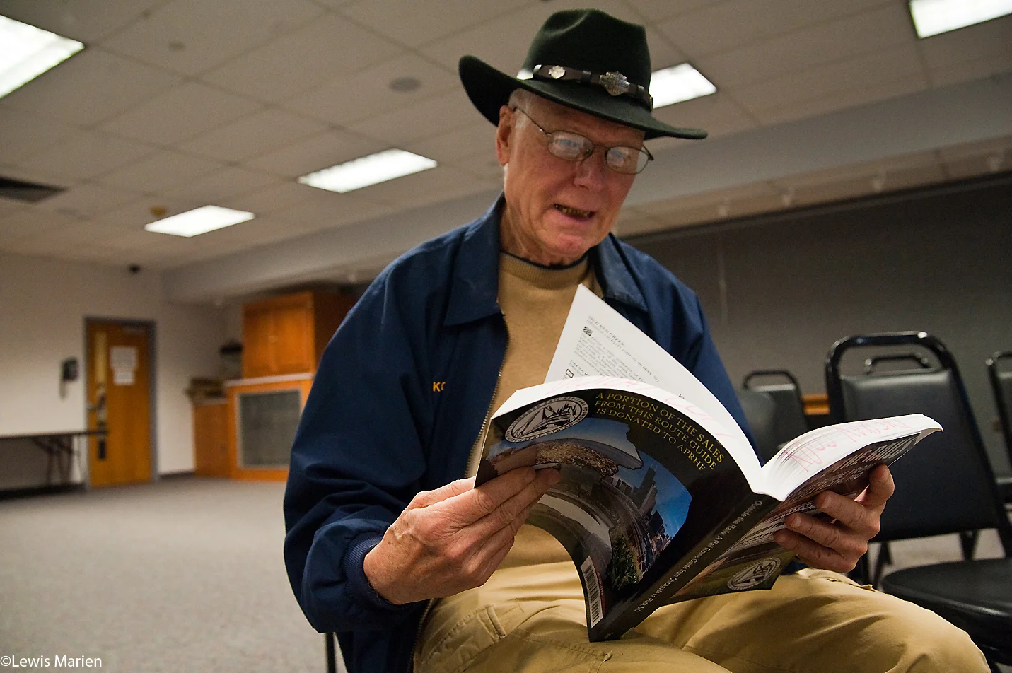 From left to right, Bob Clark, Greg Vickers Sr., and Roy Ewalt, all of Galesburg, Ill., pray at the conclusion of the first Bible study class on Sept. 14 at the Knox County YMCA in Galesburg, Ill.